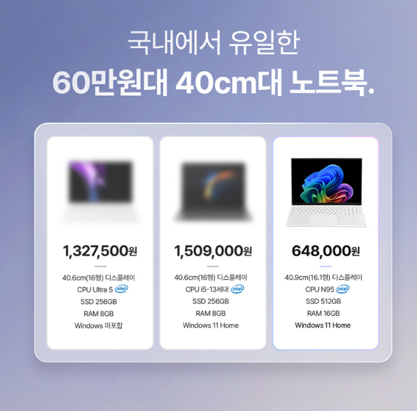 | CPU | 인텔 N95 | 저전력 기반으로 사무용/인강용에 최적화 |